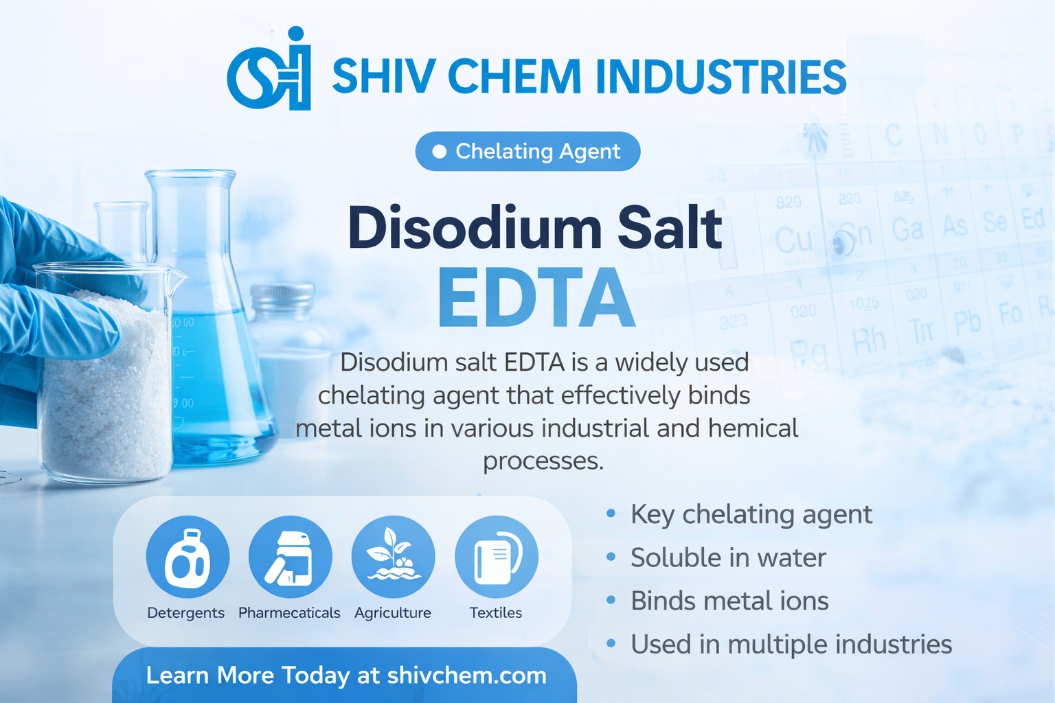 Disodium salt EDTA is derived from ethylenediaminetetraacetic acid through a neutralization process that enhances its solubility and practical usability. The compound has a well-defined molecular structure that enables it to form stable complexes with metal ions such as calcium, magnesium, and iron. This chelation process is essential for maintaining chemical balance in systems where metal ions can interfere with reactions or affect product quality. Its molecular weight, purity level, and chelation value contribute to its reliability in both laboratory and industrial applications.