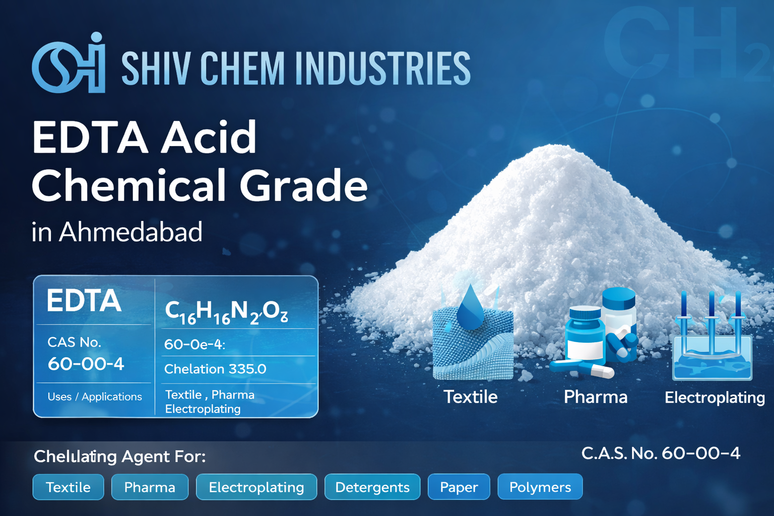 EDTA Acid Chemical Grade is used as a chelating agent to control metal ions in textile processing, pharmaceuticals, electroplating, detergents, paper manufacturing, and polymerization processes across Ahmedabad's industrial sectors.