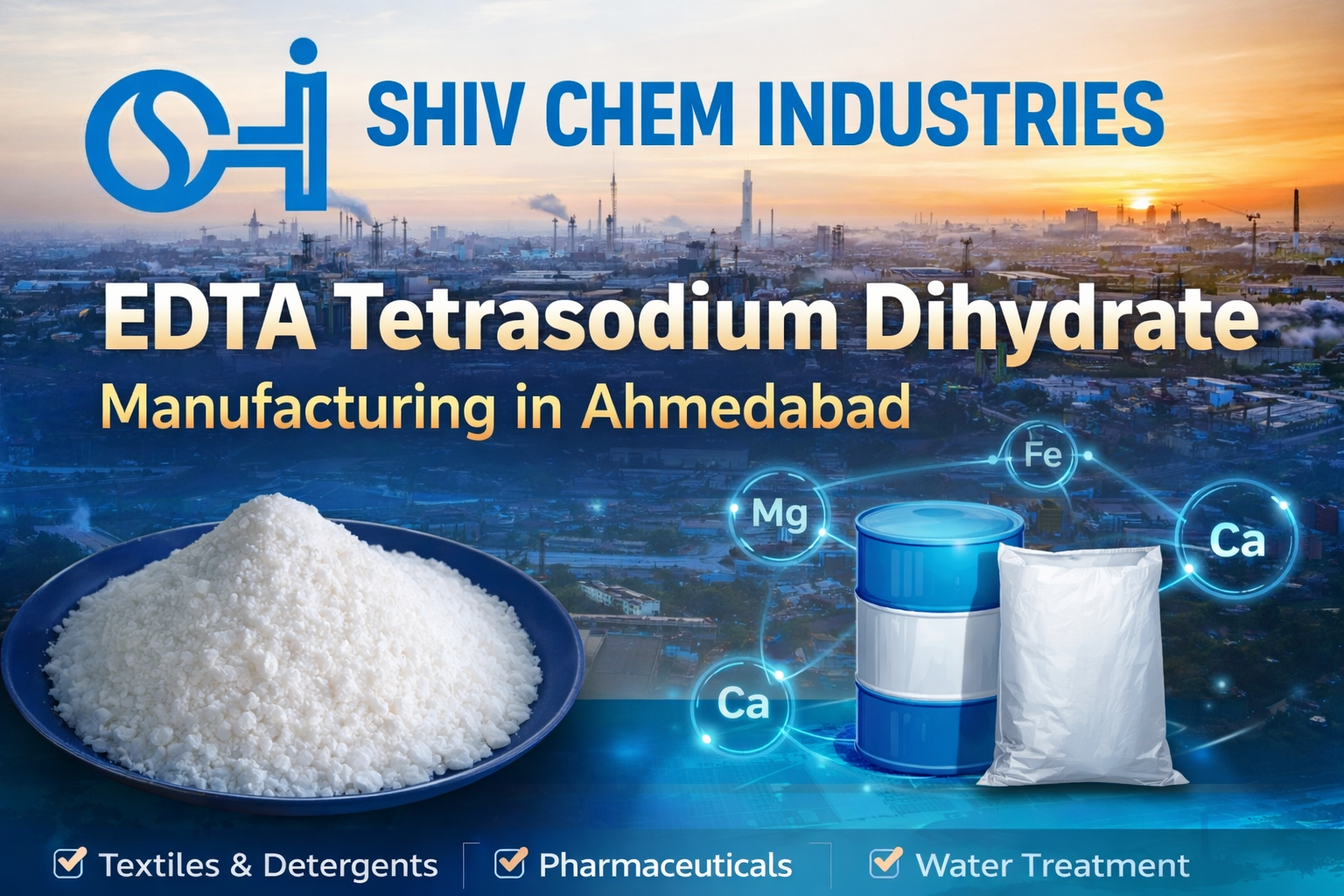 Shiv Chem Industries, based in GIDC Naroda, Ahmedabad, has been manufacturing EDTA-based products since 1987. The company follows structured production practices and maintains consistent quality parameters to meet the technical requirements of diverse industrial sectors. EDTA Tetrasodium Dihydrate is produced as an off-white, free-flowing powder with high purity and strong chelation capacity, suitable for demanding industrial applications.