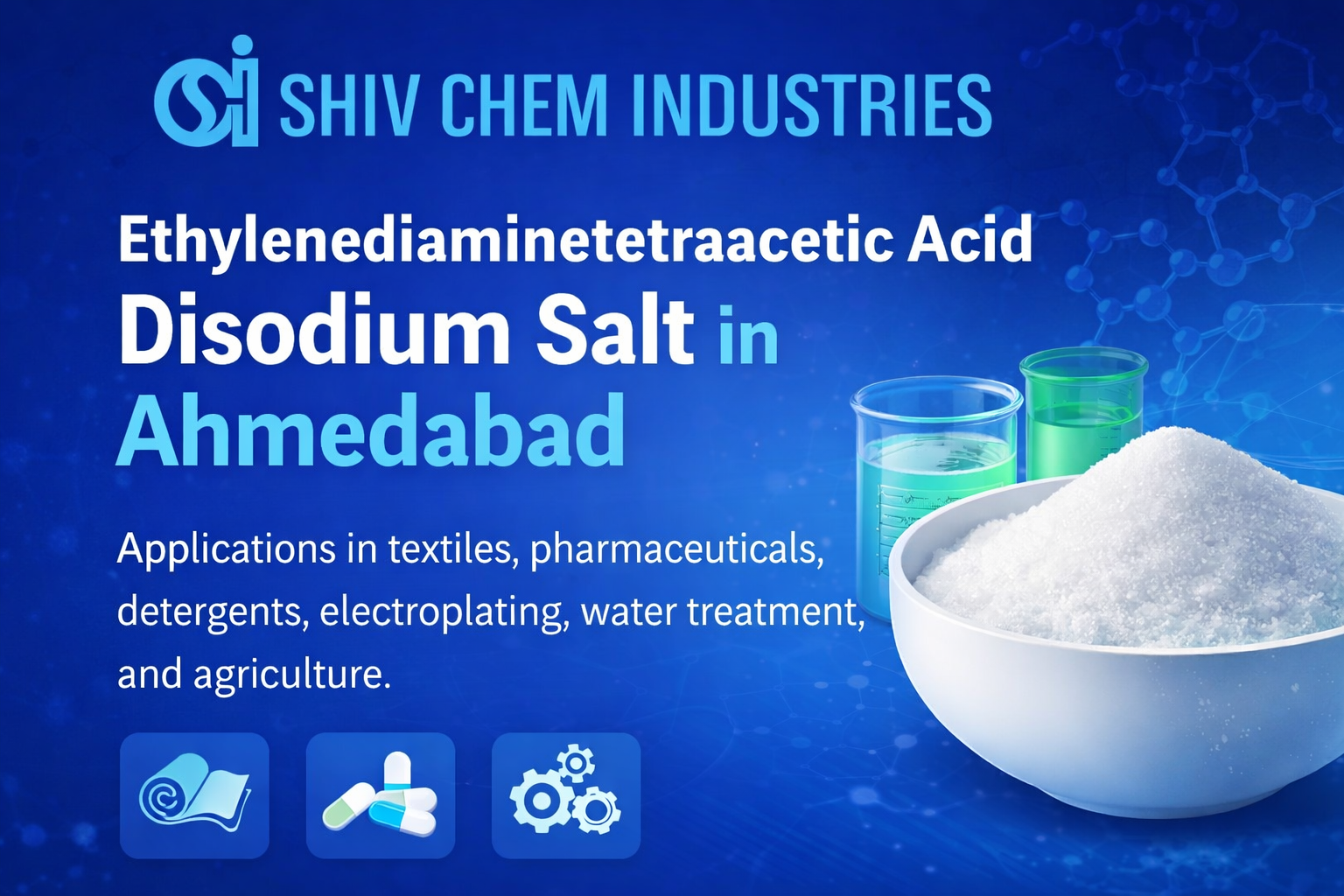 Ethylenediaminetetraacetic acid disodium salt in Ahmedabad supports a broad range of industries due to its strong chelation capacity and water solubility.